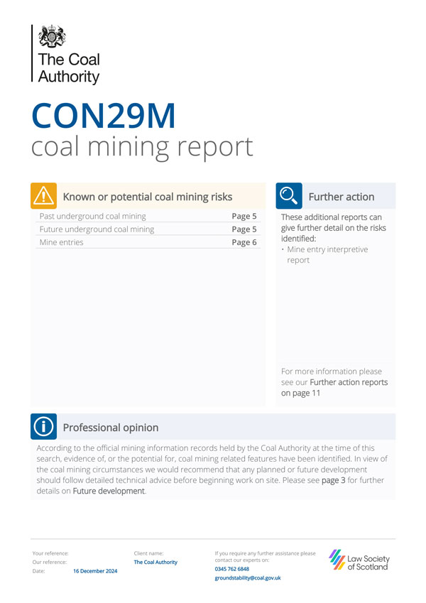 Peace of mind for property owners: Our CON29M reports help property professionals and homeowners navigate coal mining risks confidently, knowing they are using official, verifiable information from a Government Body.