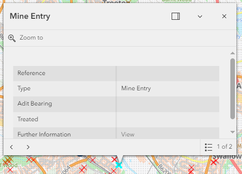 Left-click on a feature on the map to return its attribute details. Links to further information, external links, data sources and the ability to zoom to the selected feature are also provided for many of the datasets. If more than one feature is present at the selected location, links to step through all available features are presented (see image below – ‘1 of 2’ list to the bottom-right of the pop-up).