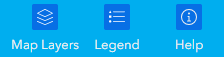 By default, the data layers for each theme will be visible in the ‘Map Layers’ window upon opening. If you close the window, it can be reopened using the ‘Map Layers’ button in the top-right of the screen, on the header bar. The ‘Legend’ button is also available here, and will display a legend for currently visible/toggled layers. The final button here is the ‘Help’ button, which will bring you back to this page.