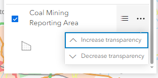 Other options available in the ‘Map Layers’ window include a toggle button to display the icon/symbology for each layer below the layer name, as well as an option to increase/decrease layer transparency using the ellipsis button.