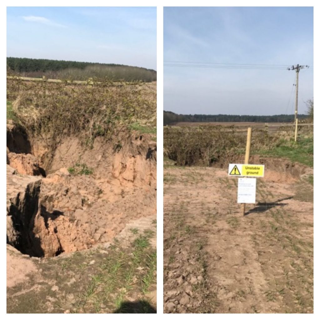 We reacted to an incident in Nottinghamshire recently. This collapse is 10m long, 5m wide and 1.5m deep, and lies on land close to the small town of Bilsthorpe.