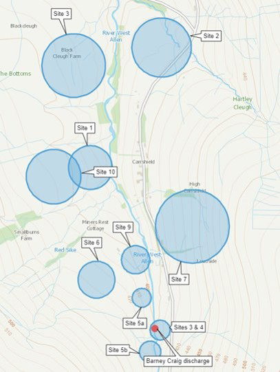 - distance from the mine water adit,