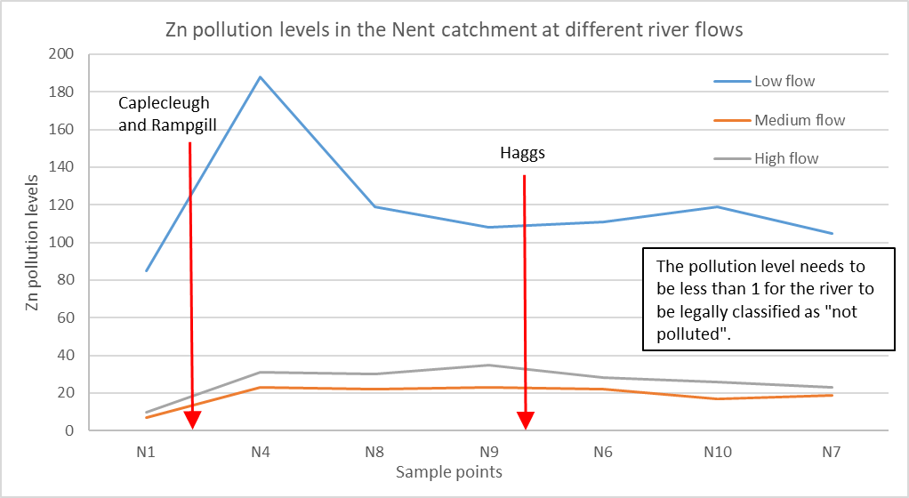 Figure 1 Zinc pollution levels in the River Nent. (see here for sample point locations.) N1 = Nent upstream of Caplecleugh; N4 = Nent upstream of sewage treatment works; N8 = Nent upstream of Nentsberry Bridge; N9 = Nent upstream of Haggs; N6 = Nent at Nenthall; N10 = Nent at Foreshield Bridge; N7 = Nent at Alston)