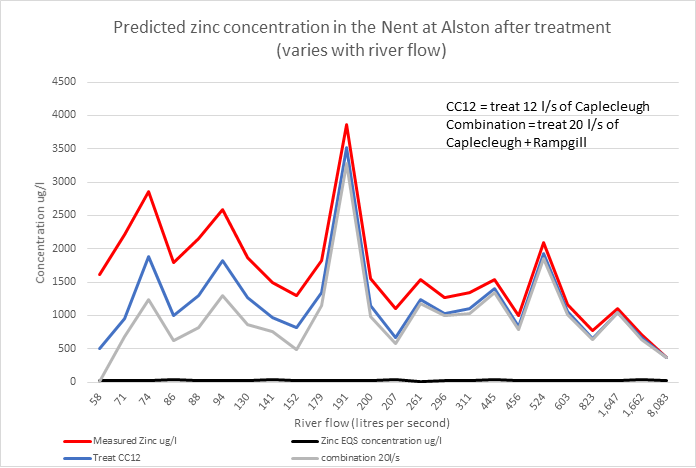 The proposed scheme will remove approximately 4.5 tonnes of zinc as well as a smaller amount of cadmium each year. Figure 3 below shows the predicted change in zinc concentrations in the River Nent at Alston for two treatment scenarios. These are plotted against river flows to show that the decrease in metal concentrations (and therefore environmental harm) is greater at lower river flows. The two treatment scenarios are: