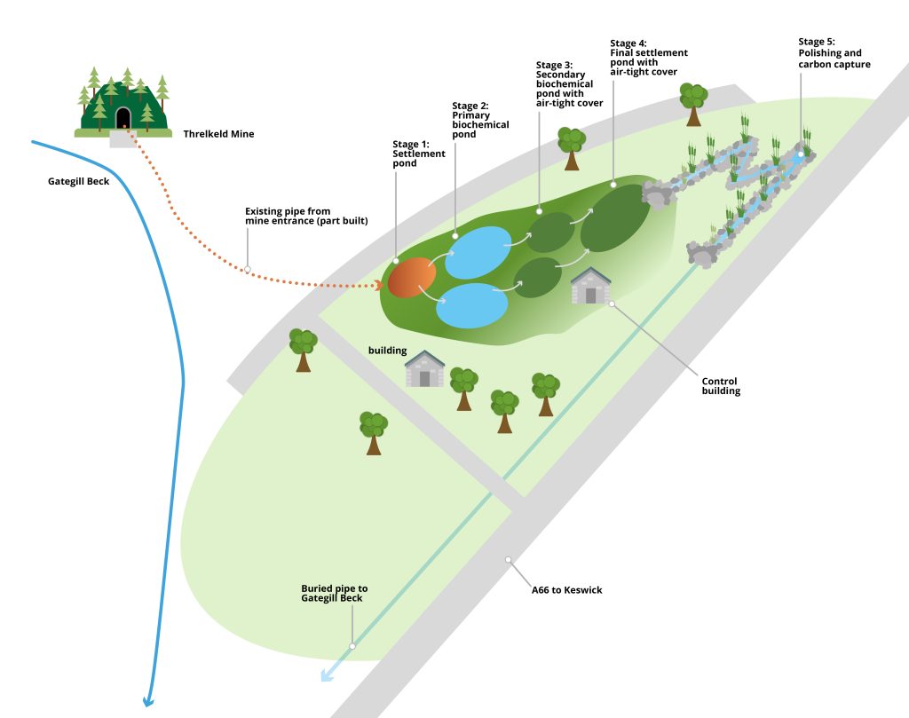 The very high metal concentrations, acidic pH and the elevated iron in the mine water mean that the proposed Threlkeld mine water treatment scheme has some extra stages when compared to other WAMM schemes such as at Force Crag and Nent Haggs.