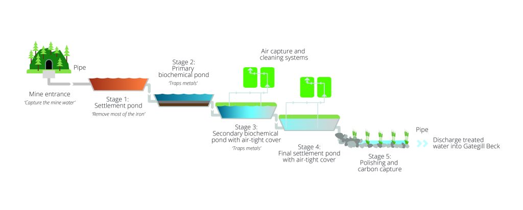 Mine water transfer: we will capture all of the mine water at the Woodend Low Level, take it to the treatment scheme in a buried pipe, and then return it to Gategill Beck after the metals have been removed.