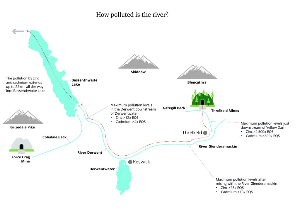 Environmental monitoring by the Environment Agency since 2010 shows that the mine water flowing out of the Woodend Low Level contains some of the highest metal concentrations in England. This mine water pollutes up to 25 km of rivers – in Gategill Beck, the rivers Glenderamackin, Greta and Derwent, all the way into Bassenthwaite Lake. Lower concentrations of metals are also washed out of the mine wastes found along the steep banks of Gategill Beck.