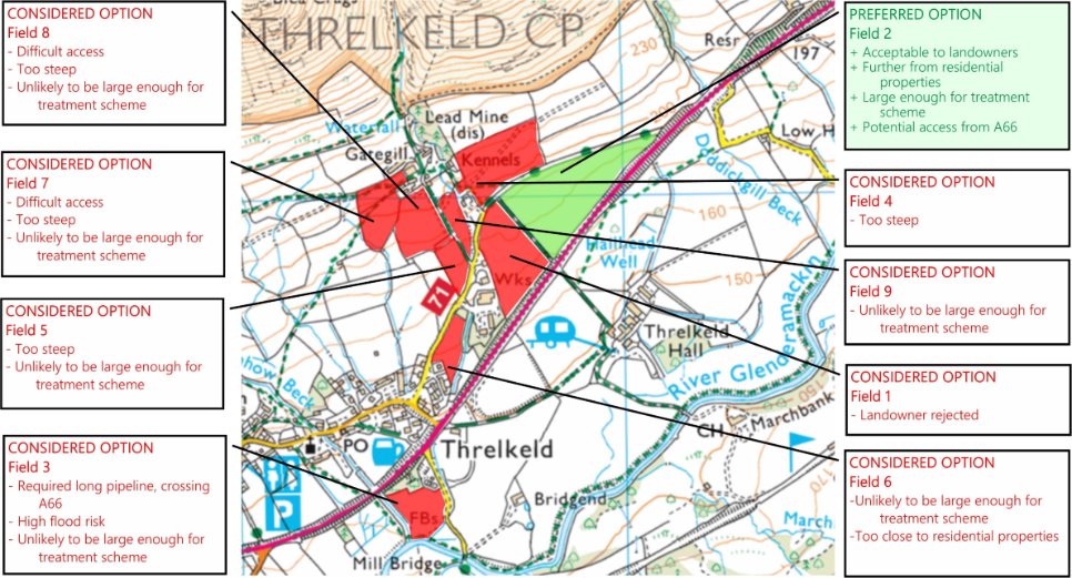 - Land adjacent to sewage works (Field 3 on map) rejected due to distance and complexity of installing pipeline from the Woodend Low Level.